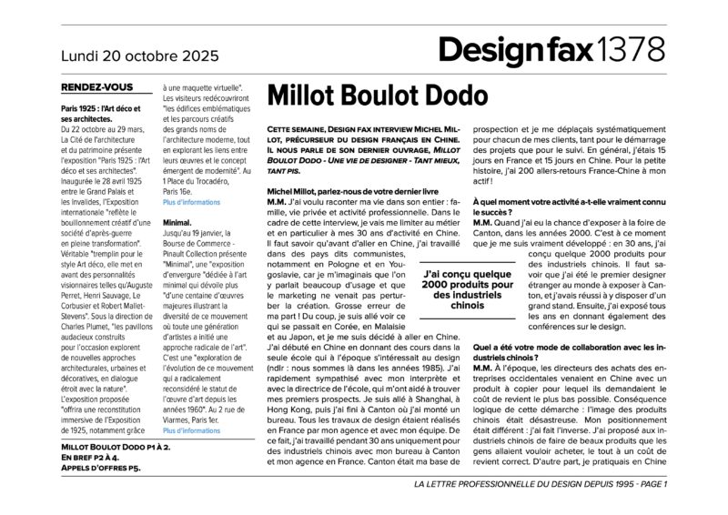 Design fax rassemble depuis 1995 celles et ceux qui font l’actualité du design français. C’est le média de référence pour celles et ceux qui veulent savoir ce qui se passe dans le monde du design.